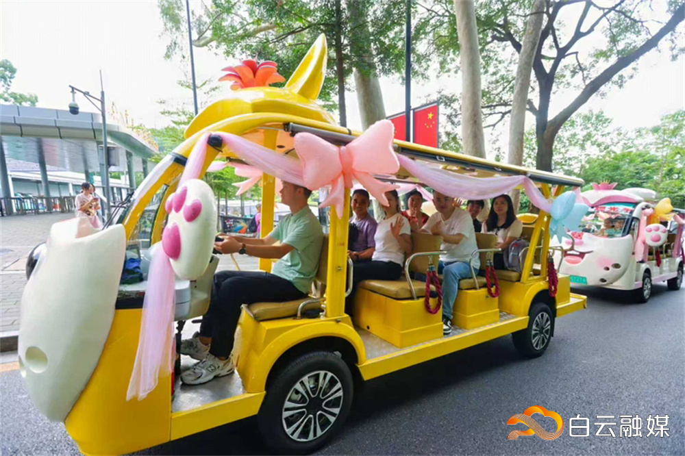 新人们乘坐装饰喜庆的电瓶车从白云山南门开启“爱在云山”之旅。